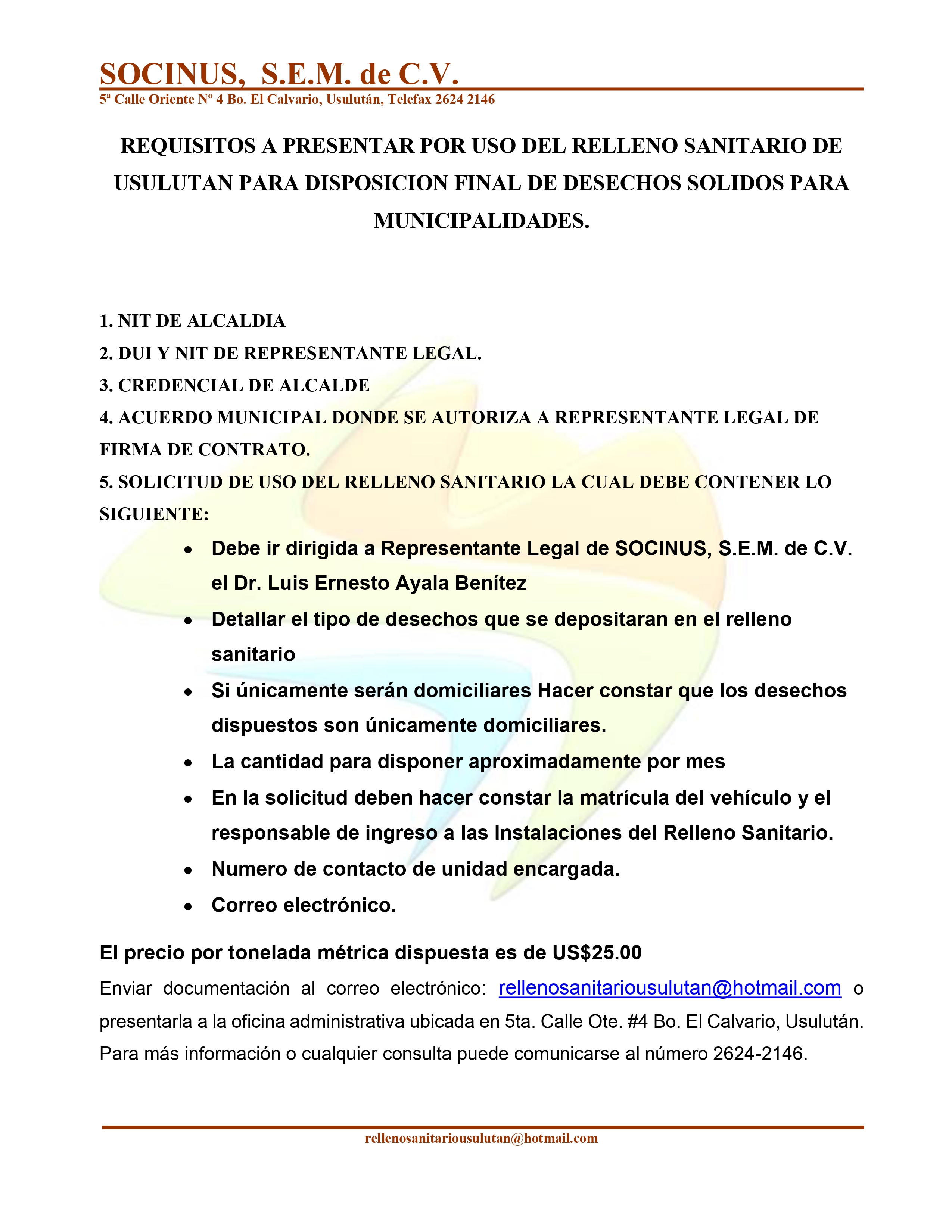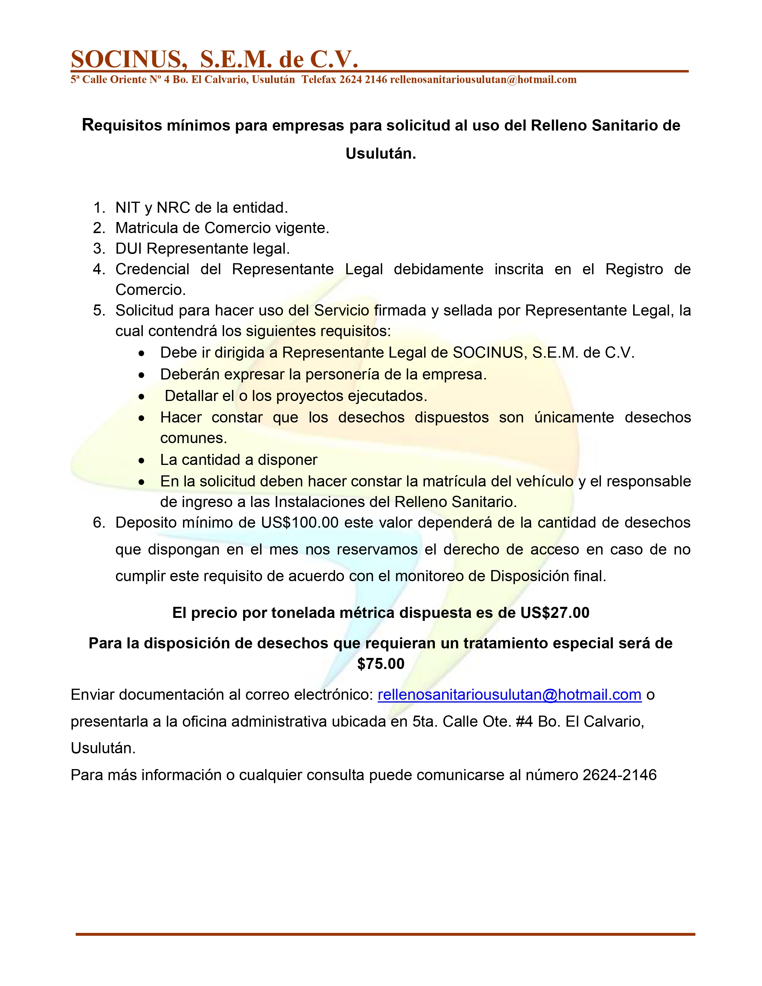 El Relleno Sanitario de Usulután SOCINUS, S.E.M. DE C.V. inició operaciones en el año 2002 y está desarrollado en un inmueble de 420,687.16 m², que equivale a 60.16 Manzanas, ubicado en el cerro El Desparramo, cantón Palo Galan, municipio y departamento de Usulután.