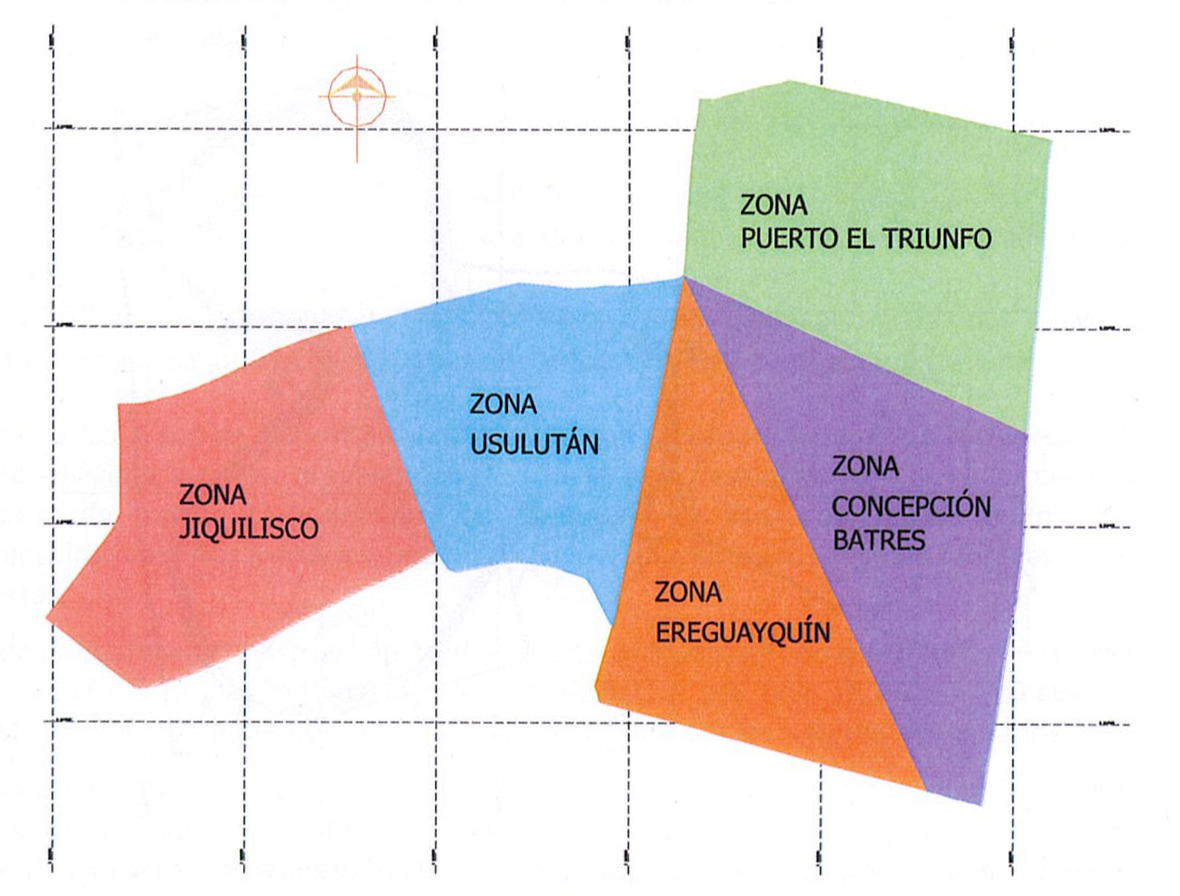 En la imagen se muestra la zonificación del proyecto. La primera zona de trabajo la constituye la Zona Puerto El Triunfo, debido a que en el diseño original se decidió trabajar primeramente esta zona y es en la que se tiene la infraestructura básica, como el acceso principal, la báscula y los accesos internos que conducen hacia la primera área habilitada del relleno sanitario.